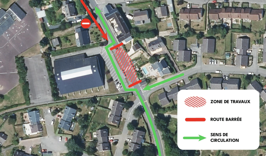 La circulation de la Route de Barneville dans le sens Avenue de la Côte des Isles > Place du Petit Bourg sera déviée par le parking de la Salle polyvalente 🔀