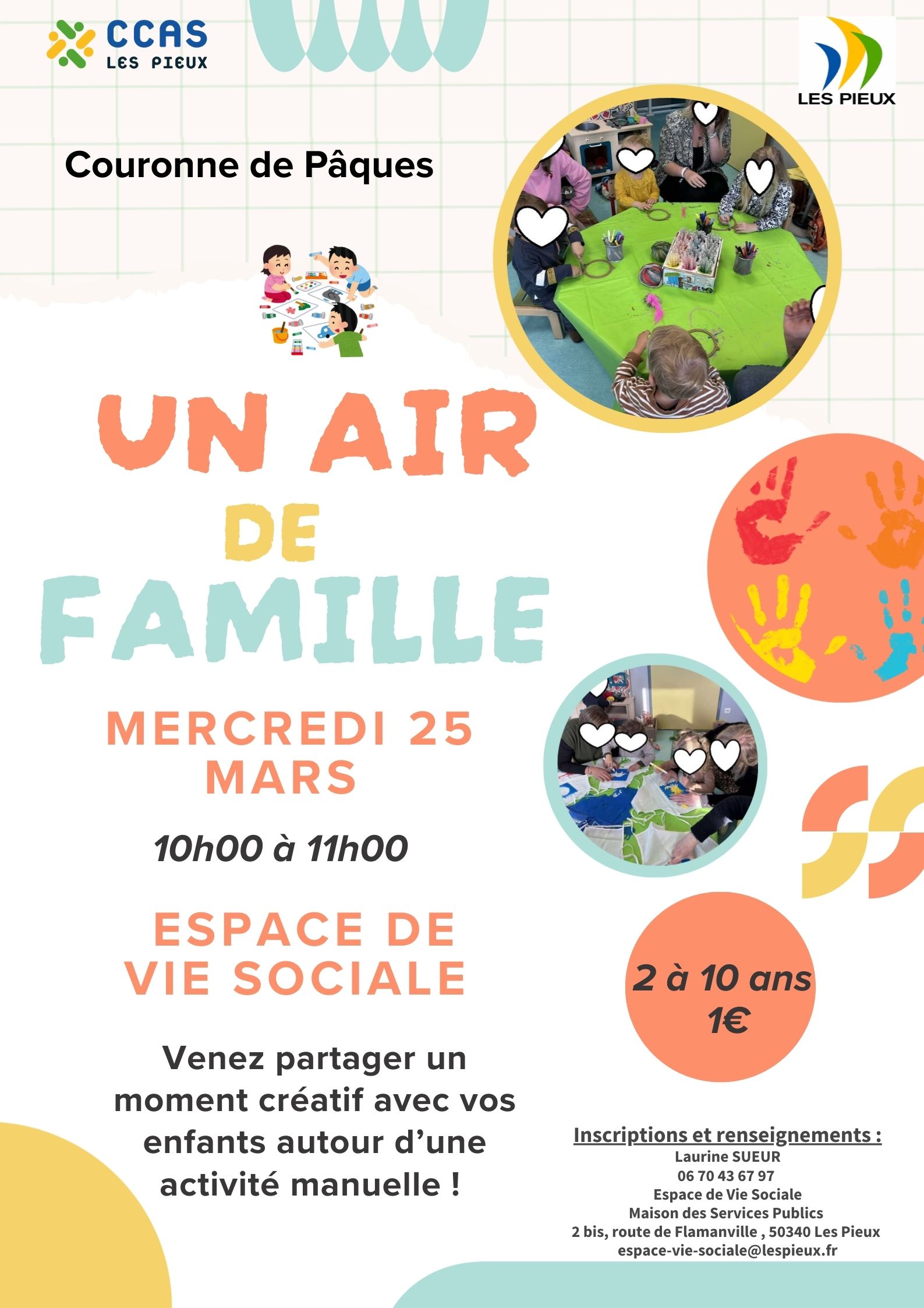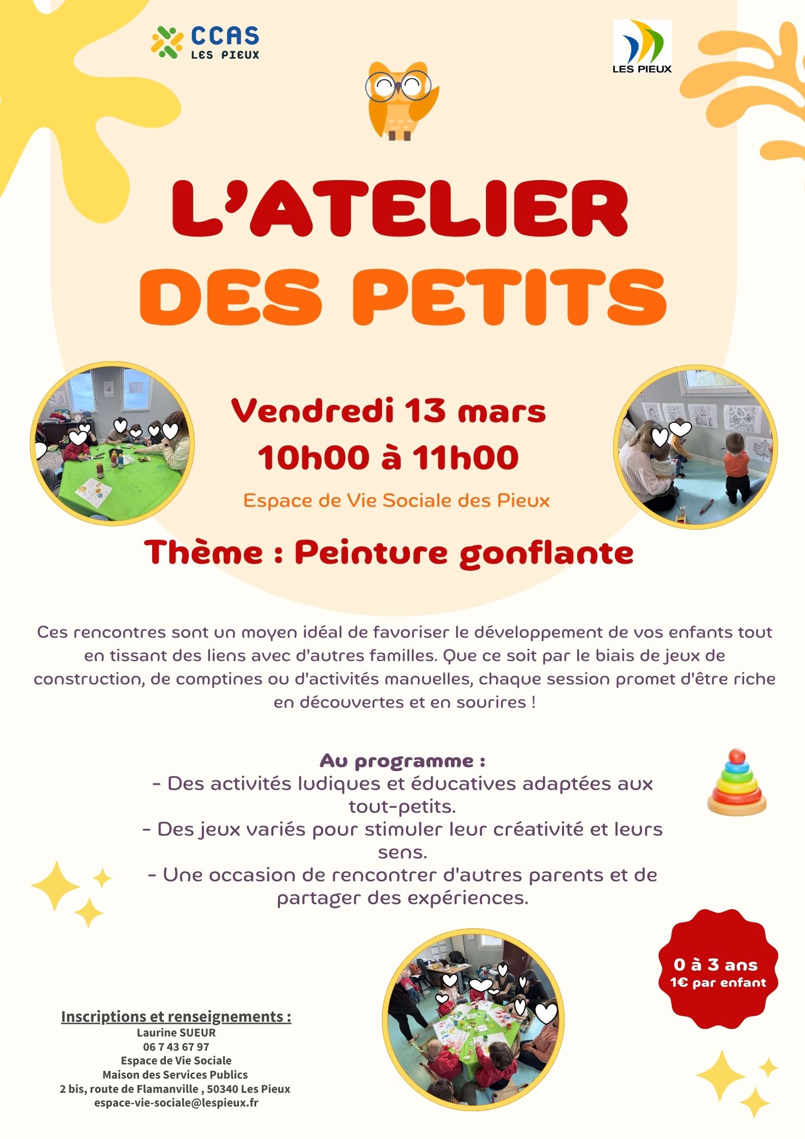 Un atelier créatif pour les enfants, pour explorer, bricoler et s’amuser ensemble. Venez partager un moment joyeux et stimulant avec votre enfant dans une ambiance conviviale ! VENDREDI 13 mars | 10h-11H à la Maison des Services Publics Tarif : 1€ / enfant 0-3 ans espace-vie-sociale@lespieux.fr | 06 70 43 67 97