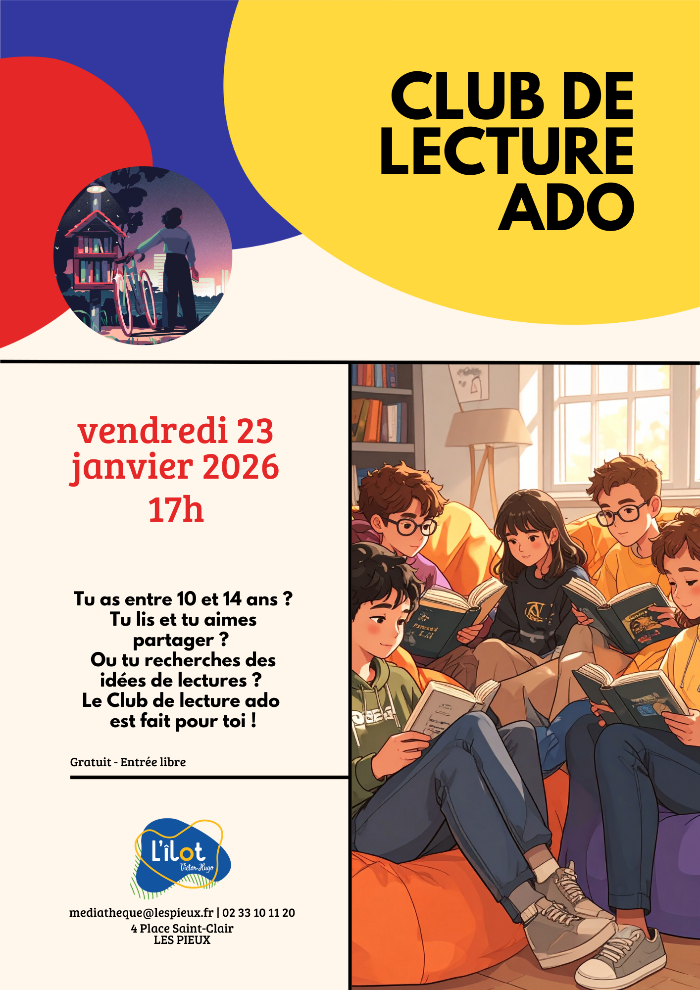 Tu as entre 10 et 14 ans ? Tu lis et aimes partager ? Ou tu recherches des idées de lectures ? Le Club de lecture ado est fait pour toi ! VENDREDI 23 JANV | 17h GRATUIT - Entrée libre mediatheque@lespieux.fr | 02 33 11 10 20