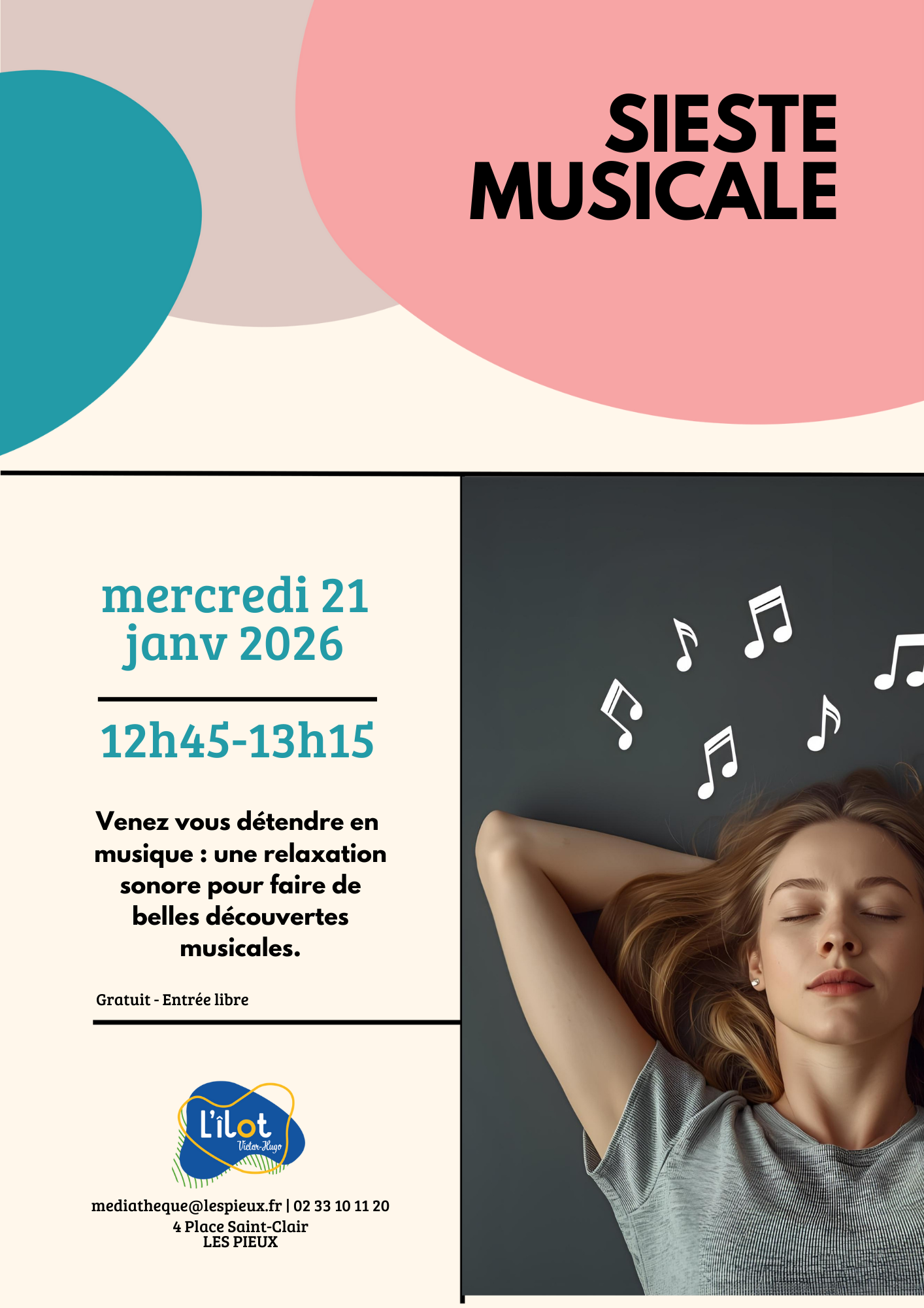 Venez vous détendre en musique le temps de 30 minutes : une relaxation sonore pour faire de belles découvertes musicales MERCREDI 21 JANV | 12H45 GRATUIT - Entrée libre mediatheque@lespieux.fr | 02 33 10 11 20